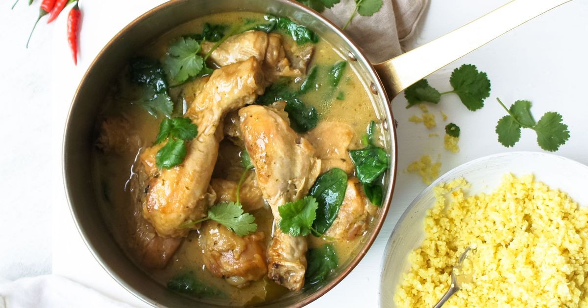 Agregue la pasta de curry a la sartén. Cocine, revolviendo, durante 1 minuto o hasta que esté aromático. Agregue el pollo y revuelva para cubrir. Agrega la crema de coco, el caldo y las hojas de limón. Llevar a hervir. Reducir el calor al mínimo. Cocine, sin tapar, durante 40 minutos o hasta que el pollo esté tierno. Mezcla las espinacas.