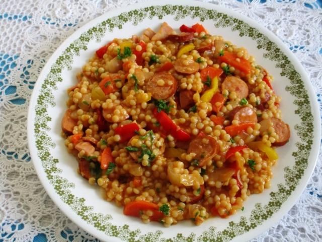 Agregue el cuscús perla y el pimiento y cocine hasta que quede suave. Si es necesario, agregue un poco de agua. Agregue el ajo, el perejil y mezcle. Sazone con Caldo de Verduras Gourmet y Pimienta.