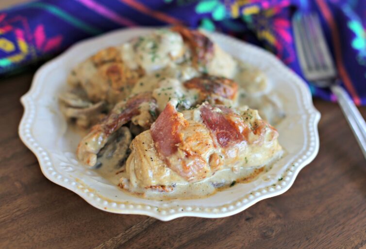 Para esta versión, rellené el pollo con queso y jamón, lo enrollé y luego lo envolví en un trozo de tocino. Por supuesto, el tocino hace que todo sea mejor, ¡así que pensé que era un buen toque!