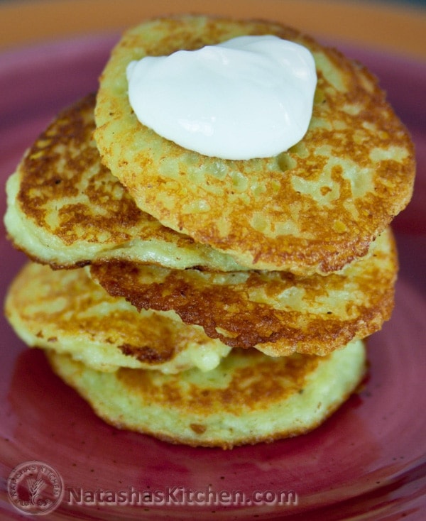 Estos no son los panqueques de papa que publiqué anteriormente que usaban puré de papas sobrante. Se trata de patatas crudas y cebollas finamente ralladas. Es un plato clásico ucraniano llamado Deruny. Nuestras madres todavía los hacen regularmente. Esta es en realidad la publicación de Vadim. Coincidió con nuestras recetas familiares y fue perfecto.