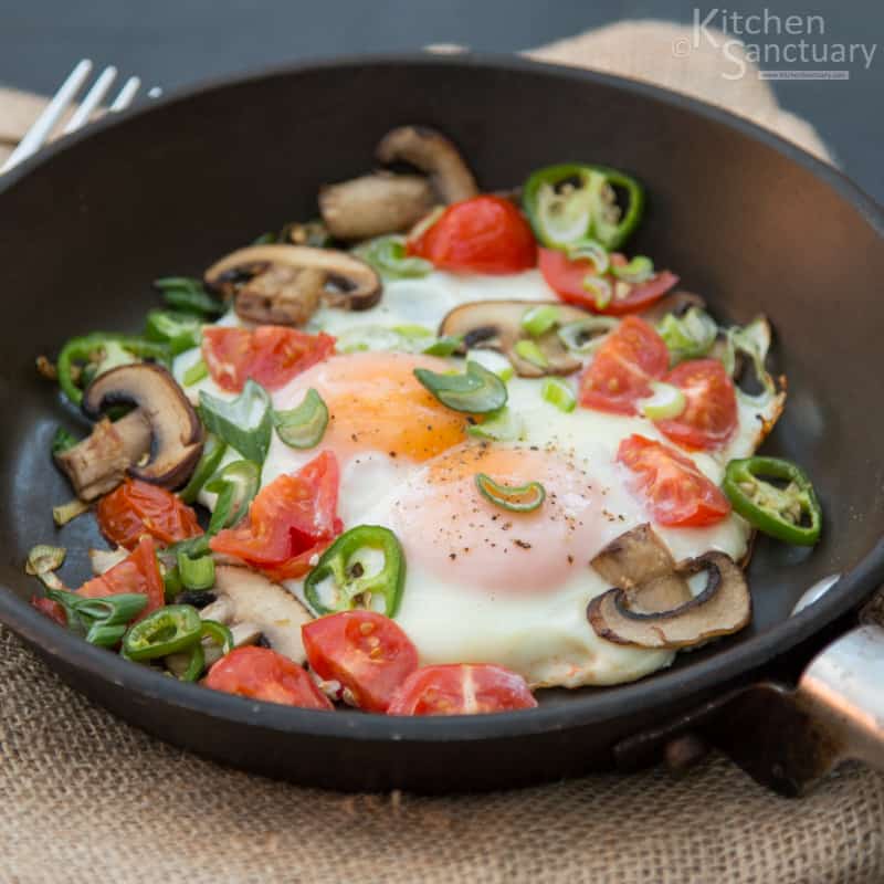 Agregue los champiñones y cocine por unos minutos, revolviendo ocasionalmente. Sazone con un poco de sal y pimienta, luego agregue el jalapeño en rodajas. Mezcle suavemente y rompa los dos huevos en la sartén. Agregue las cebolletas y los tomates y una buena pizca de sal y pimienta. Deja que se cocine durante unos 2 minutos.