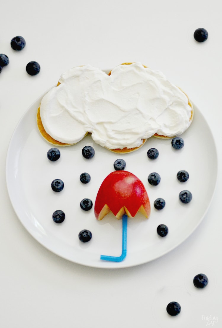 ¡Quítate la tristeza del día lluvioso con el arte culinario de este niño! ¡A los niños les encantará este desayuno de día lluvioso con mini panqueques, ducha de arándanos y sombrilla de manzana roja!