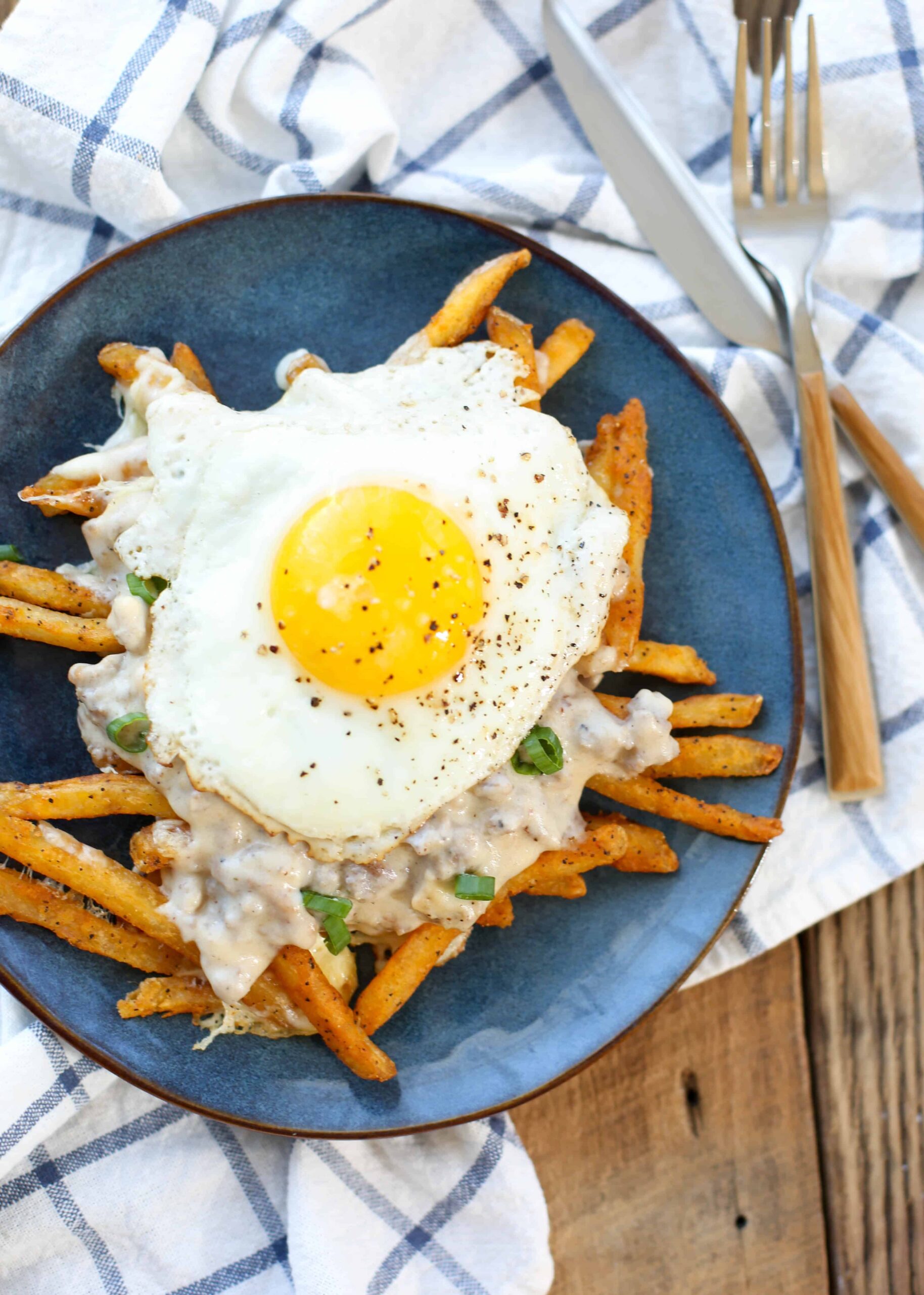 Las papas fritas crujientes y el requesón derretido se cubren con una sabrosa salsa de salchicha y huevo frito que es tan fácil de crear esta poutine de desayuno inolvidable.