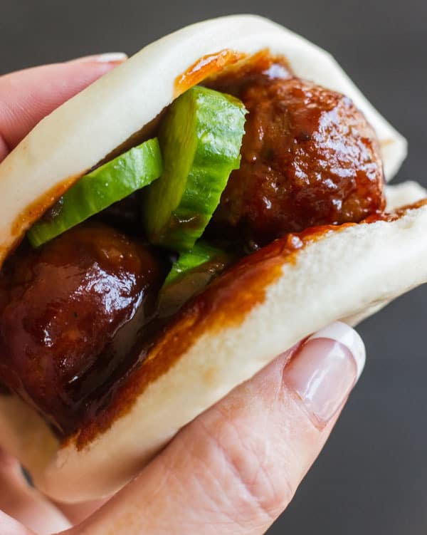 Para un bollo compré un poco de Gua Bao, que son bollos blandos de “hamburguesa” taiwaneses, aunque también los he oído llamar “bollos de panceta de cerdo” (y tenía panceta de cerdo en ellos … tienes la oportunidad) Cualquier mercado asiático lo hará llévelos y mi tienda local también los mantiene en stock. Normalmente los encontrarás en la sección de congelados. Son fáciles de usar, simplemente colócalos en el microondas con un poco de agua. Son cálidos y muy suaves. Los amarás. ¡Mis hijas incluso les pusieron un poco de mantequilla de maní y mermelada!
