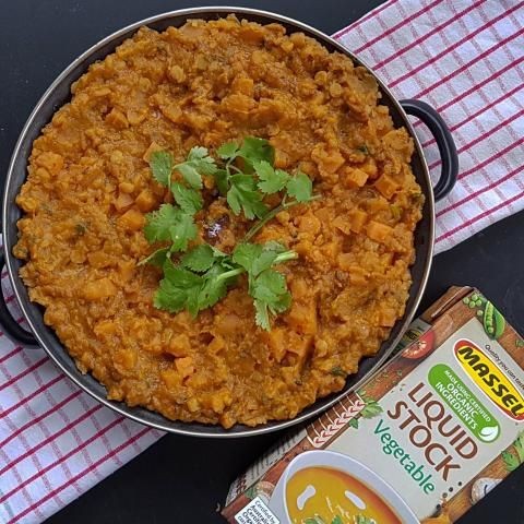 Agregue la mezcla de especias cocidas con la batata y las lentejas. Lleve a ebullición y cocine a fuego lento durante 10 minutos o hasta que la batata esté tierna.