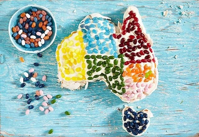 Cepille con crema batida y decore con gominolas Jelly Belly para los estados y territorios. Si lo desea, espolvoree con azúcar en polvo.