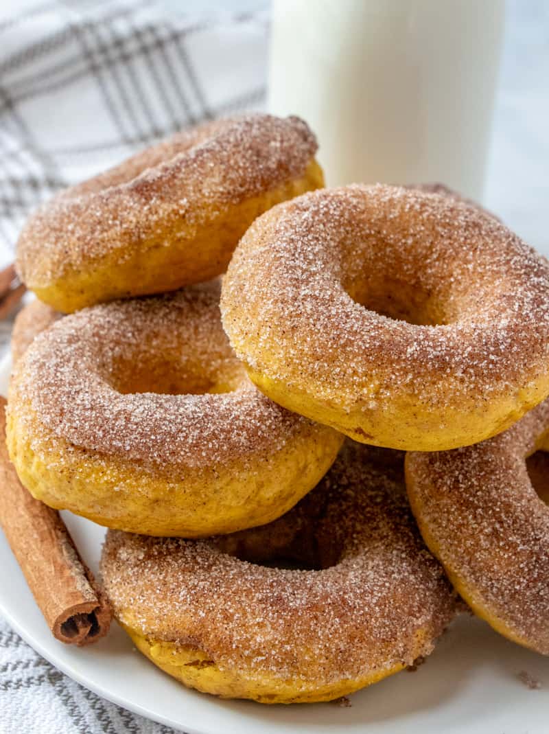 Esta receta de donas de calabaza realmente toma lo básico de todas mis recetas y reemplaza la crema agria con calabaza y agrega un poco de sabor al pastel de calabaza.