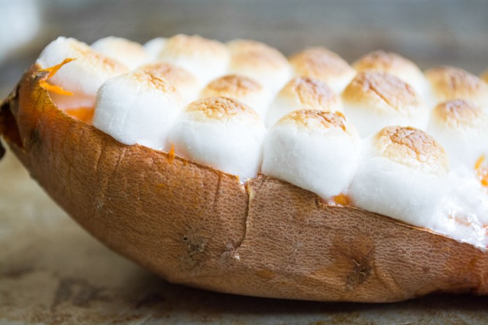 Las batatas hervidas dos veces se cubren con mini malvaviscos para una deliciosa guarnición otoñal y festiva. ¡Esta receta saca al bebé de todos!