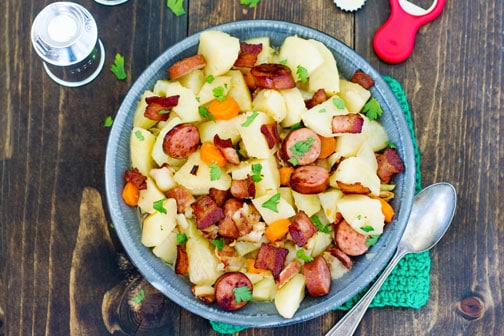 - En la olla de cocción lenta, agregue las papas, las cebollas, las zanahorias, el ajo y el tocino y la salchicha dorados.