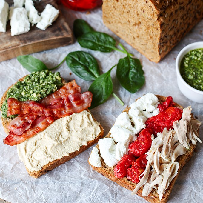 Puedo ver mucho más de mi tiempo ocupado pensando en nuevas combinaciones ahora… Definitivamente es algo en lo que hay que pensar. Mi primer intento de armar esto involucró tocino en una pieza y pesto en otra, ¡eh! El tocino y el pesto no van bien con un sándwich. Sin embargo, ¿ponerlos uno al lado del otro en la misma pieza? Bueno, habrá algo de contaminación cruzada, pero no de manera ofensiva.