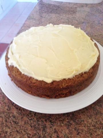Verter en un molde preparado y hornear a 180°C (con ventilación forzada) durante 45 minutos. Dejar enfriar antes de glasear.