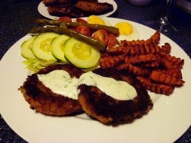 Forme la mezcla en pequeñas empanadas, cubra con harina, huevo y pan rallado.