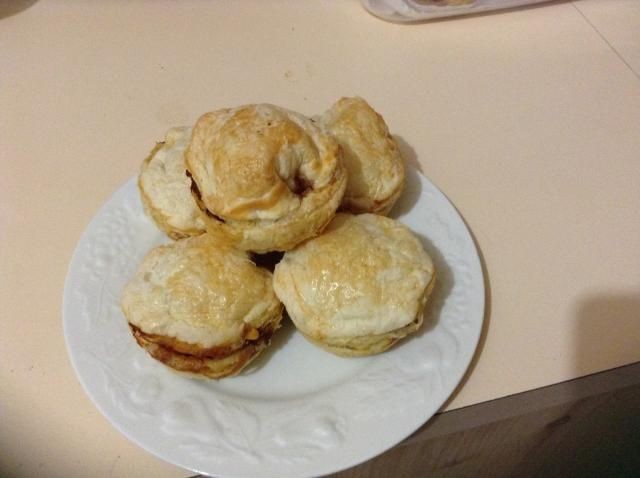 Divida la mezcla de carne cocida entre los agujeros. Cortar discos de 24 x 6 cm de la masa de hojaldre. Pincelar con huevo. Presiona los pasteles. Pincelar con huevo. Hornea durante 25 minutos o hasta que adquiera un color dorado intenso.