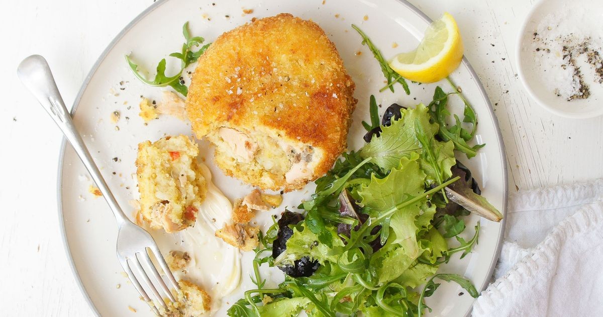 Combine el salm贸n, el pur茅 de patatas, el tomate, la cebolla, el queso, los huevos, el jugo de lim贸n, la mantequilla, el pan rallado y el curry en un recipiente grande con tapa.