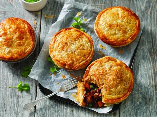 Divida la mezcla de cordero entre las conchas de hojaldre. Cubra con círculos hinchados, presione los bordes para sellarlos y marque los bordes con grapas. Pincelar con huevo. Coloque en una bandeja para hornear caliente y hornee durante 45 minutos o hasta que la masa esté dorada e hinchada. Déjalo reposar durante 5 minutos y luego retíralo de la sartén.