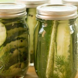 Experimenté un poco e hice la mitad de mis ollas con ajo normal y eneldo; a los otros dos les añadí unos granos de pimienta negra y pimiento rojo picado. Después de hacer una prueba de sabor, descubrí que los pepinillos y las hojuelas de chile tenían mucho más sabor (aunque no los llamaría picantes). Los de fuera seguían estando buenos, aunque mucho más blandos. Esto es enteramente una cuestión de preferencia personal; Siéntase libre de jugar con diferentes combinaciones de ingredientes para encontrar su punto dulce personal.