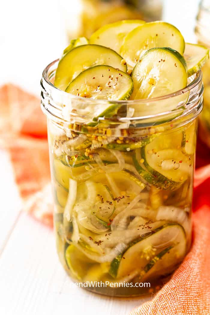¡Una de las mejores partes de los encurtidos de nevera es que no necesitas frascos para prepararlos! Las rodajas de pepino fresco se infunden con el sabor de una mezcla de vinagre sazonada y luego se almacenan en el refrigerador.