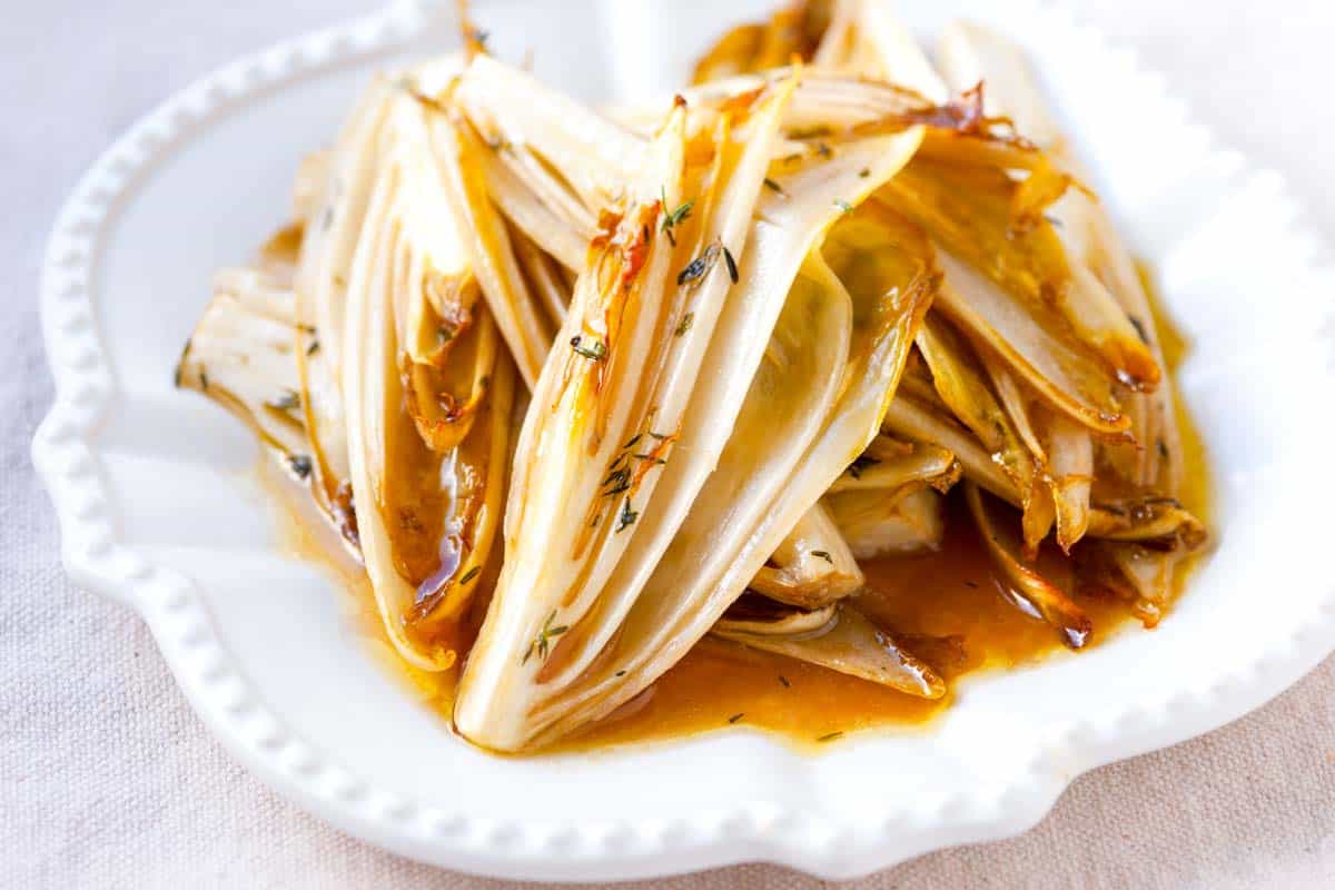 Comience cortando la escarola en rodajas de tamaño similar. Agregue a una bandeja para hornear y agregue una mezcla de mantequilla derretida, jarabe de arce, sal y tomillo fresco. Hornee a 350 grados durante 20-25 minutos hasta que estén tiernos y los bordes comiencen a dorarse.