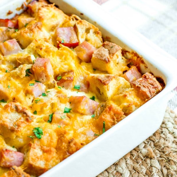 Esta cazuela de panecillos ingleses de jamón y queso es una cazuela de desayuno fácil de preparar, perfecta para las vacaciones.