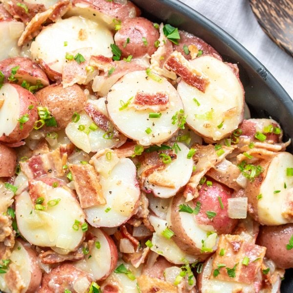 ¡Esta receta de ensalada de papa alemana es una de las MEJORES recetas de ensalada de papa sin mayonesa! Las patatas rojas, muy tiernas y perfectamente cocidas, se aderezan con una salsa especiada a base de mostaza de Dijon y vinagre. Luego se cubren con tocino y las cebollas cocidas se sirven calientes.
