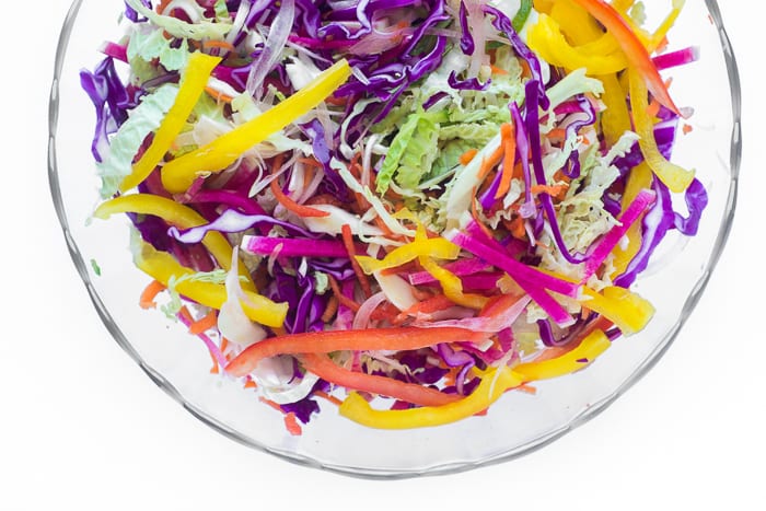 Me encanta la ensalada de col: está a la altura del aderezo como uno de los alimentos más perfectos, especialmente cuando hace calor. Es tan saludable como versátil, y creo que agrega ese toque perfecto a tantos clásicos del verano, desde perritos calientes y hamburguesas hasta tacos de pescado y kebabs a la parrilla. Me divertí un poco con este, buscando la mayoría de las verduras del día que pude encontrar para lograr un efecto de arcoíris.