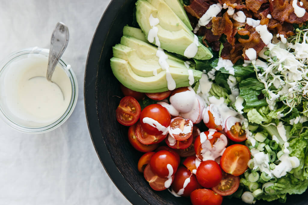 Mientras el tocino se cocina en el horno, corte la lechuga, corte los tomates por la mitad, corte una cebolla verde y pele y pique un aguacate. Deje que el tocino se enfríe, luego desmenúcelo en el tazón y revuélvalo todo junto con una simple salsa de mayonesa (que usa mi receta casera de mayonesa).