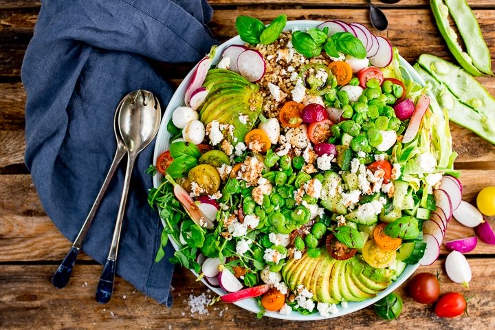 Después de eso, es un caso simple de construir la ensalada. Me gusta servirlo en un tazón grande para compartir para que todos puedan comer y ayudarse a sí mismos]: