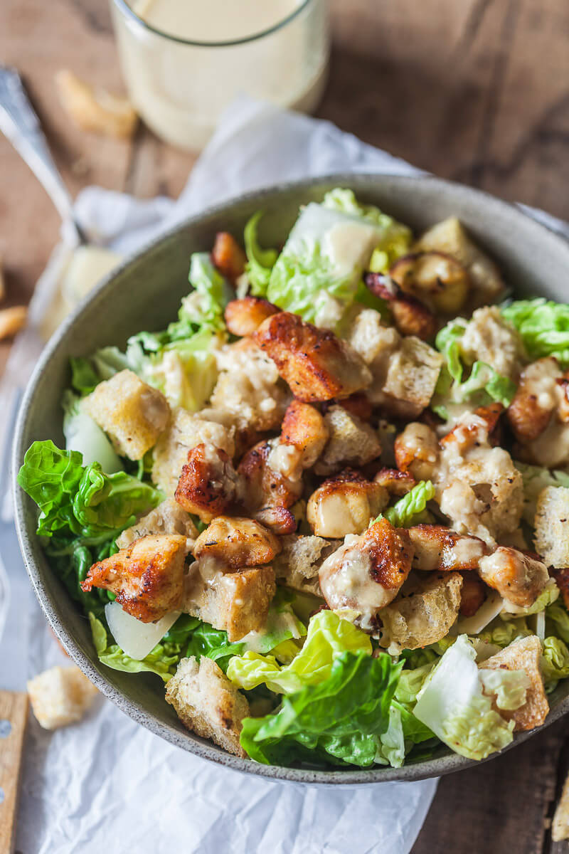 Por mucho que amemos nuestras ensaladas, hay una que disfrutamos casi exclusivamente en vacaciones, que es la Ensalada César con Pollo. Cuando viajamos en vacaciones de verano, a menudo elegimos una ensalada como un almuerzo ligero y rápido que es refrescante en el calor del verano y fácil de comprar en la tienda de comestibles.