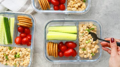 - Coma inmediatamente o divídalo en recipientes de preparación de alimentos de pepino/tomate y galleta y guárdelo en el refrigerador.