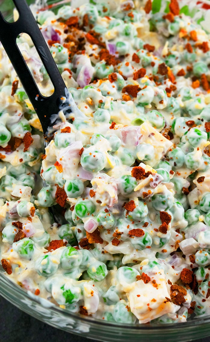 La mejor receta clásica, antigua, rápida y fácil, ensalada cremosa de guisantes hecha en casa con ingredientes simples en una sartén o tazón en 20 minutos. ¡Esta ensalada fría de verano está rellena de guisantes, crema agria, mayonesa, cebolla, tocino, queso cheddar!