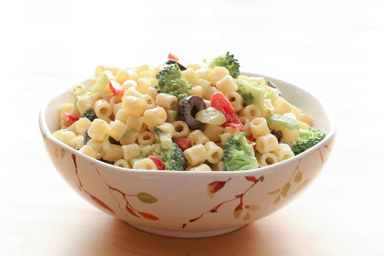Ensalada de pasta cremosa ligera y ligeramente sazonada con suficiente aderezo cremoso para cubrir la pasta y las verduras, esta es una gran ensalada de pasta fría.