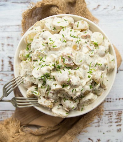 Esta cremosa ensalada de patata se prepara con patatas tiernas y se rellena con tocino, cebollín y huevo cocido. ¡Las ensaladas de papa no se vuelven más irresistibles que esto!