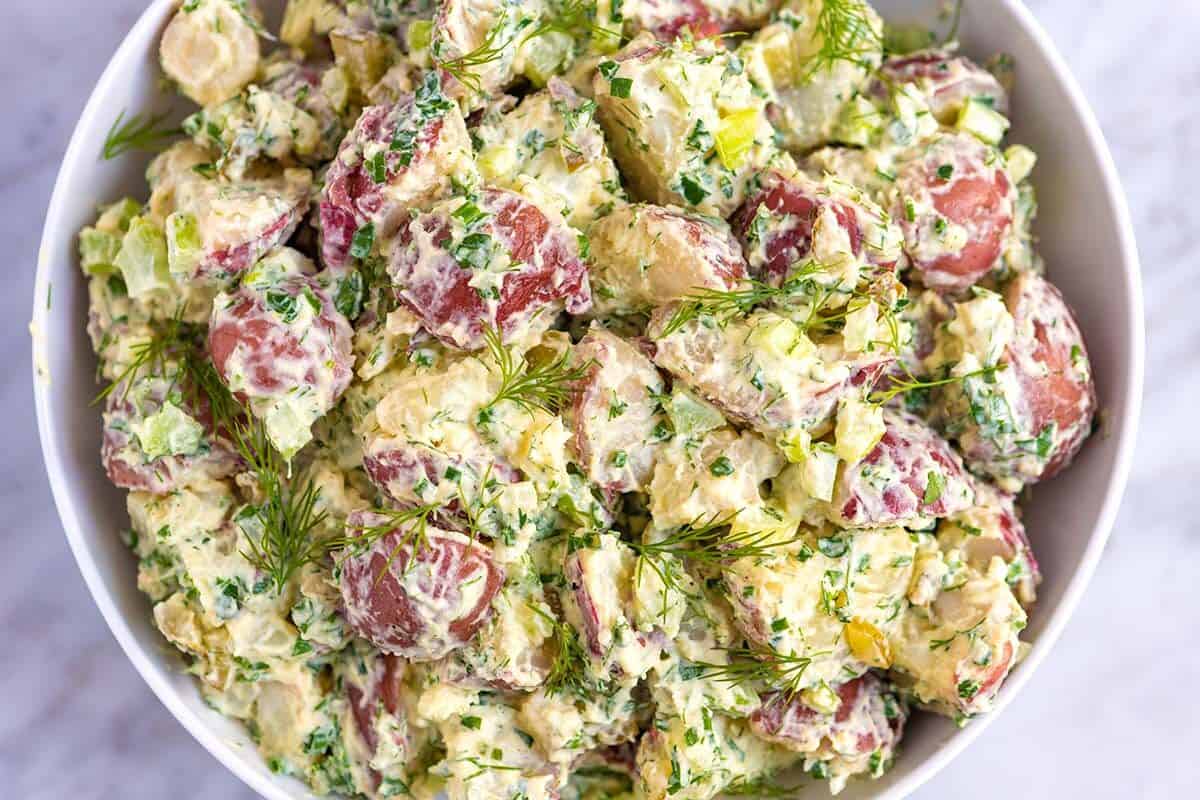 La ensalada de patata es una de mis guarniciones favoritas. Es fácil de hacer, sabe mejor cuando se prepara con anticipación y a todos les encanta. Tenemos algunas recetas de ensalada de papas en Inspired Taste: echa un vistazo a nuestra ensalada de papas cremosa fácil o esta ensalada de papas con hierbas y sin mayonesa.