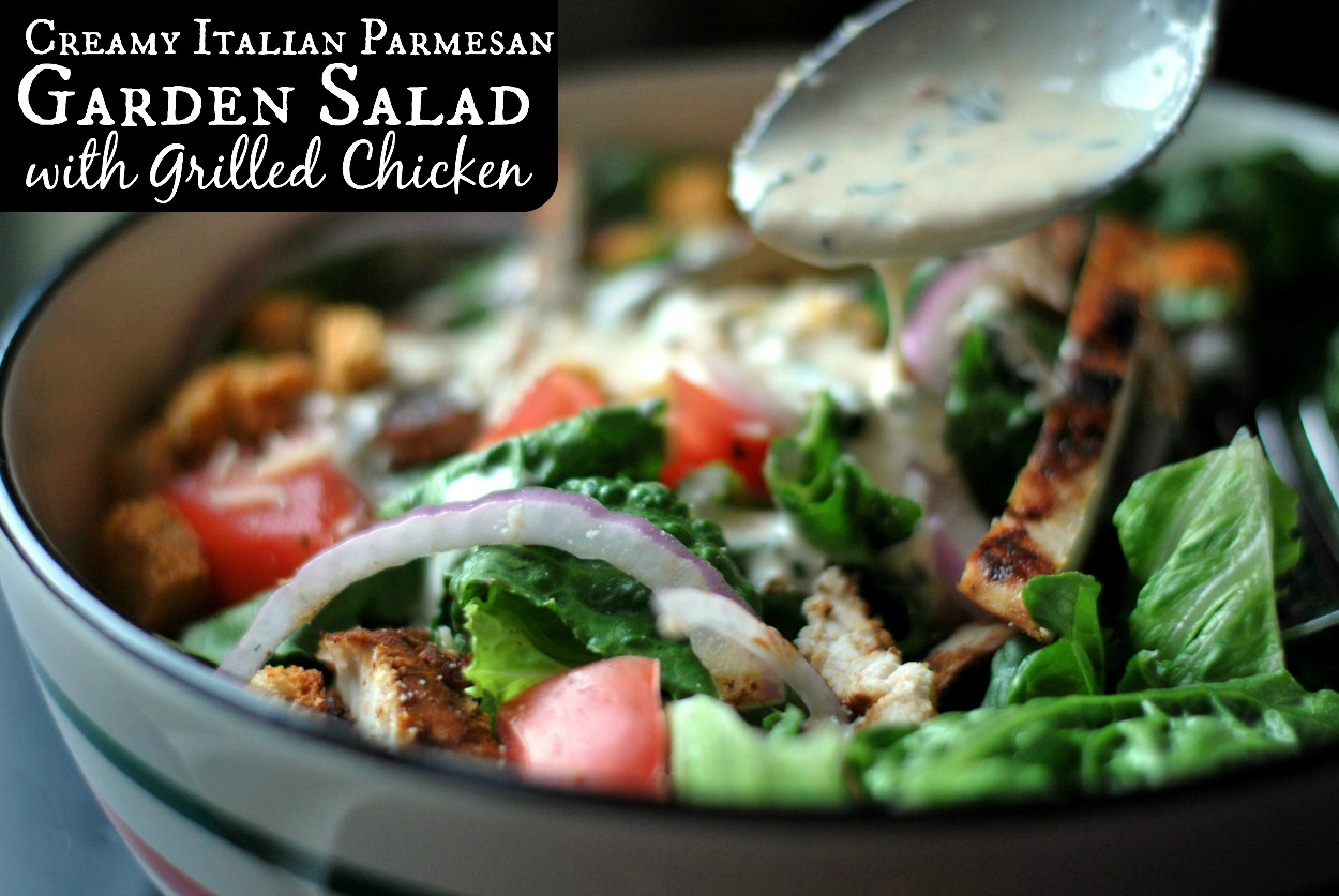 Ensalada cremosa de jardín italiano con ingredientes de pollo Lechuga Cebolla roja Aceitunas negras Pimientos Plátano Tomates rallados Parmesano Crostini Pechuga de pollo a la parrilla, en rodajas (Nos encanta esto, este y este adobo) Salsa cremosa de parmesano italiano (receta a continuación) direcciones Acomoda los ingredientes en orden de arriba hacia abajo. Sirve inmediatamente ¡Disfruta!