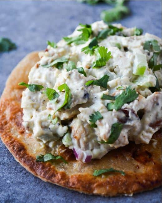 - Coloque una cucharada de ensalada fría de pollo encima de la tortilla frita/horneada y sirva con guarnición de cilantro.