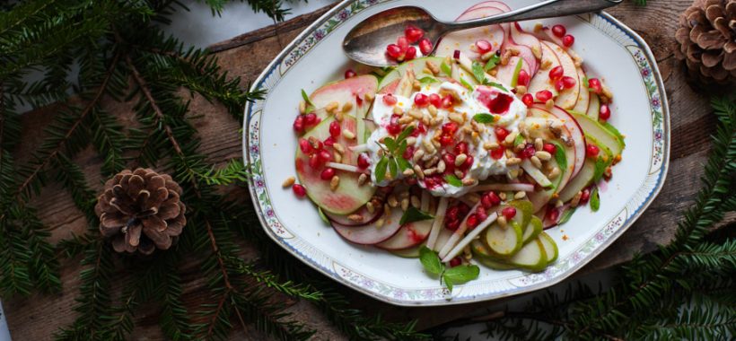 Esta ensalada se inspiró en una hermosa receta de carpaccio de manzana del nuevo libro de cocina navideña de Jamie. Es un libro excelente, repleto de recetas vibrantes para las fiestas, y bueno, hice mi lista de libros de cocina favoritos en 2016.