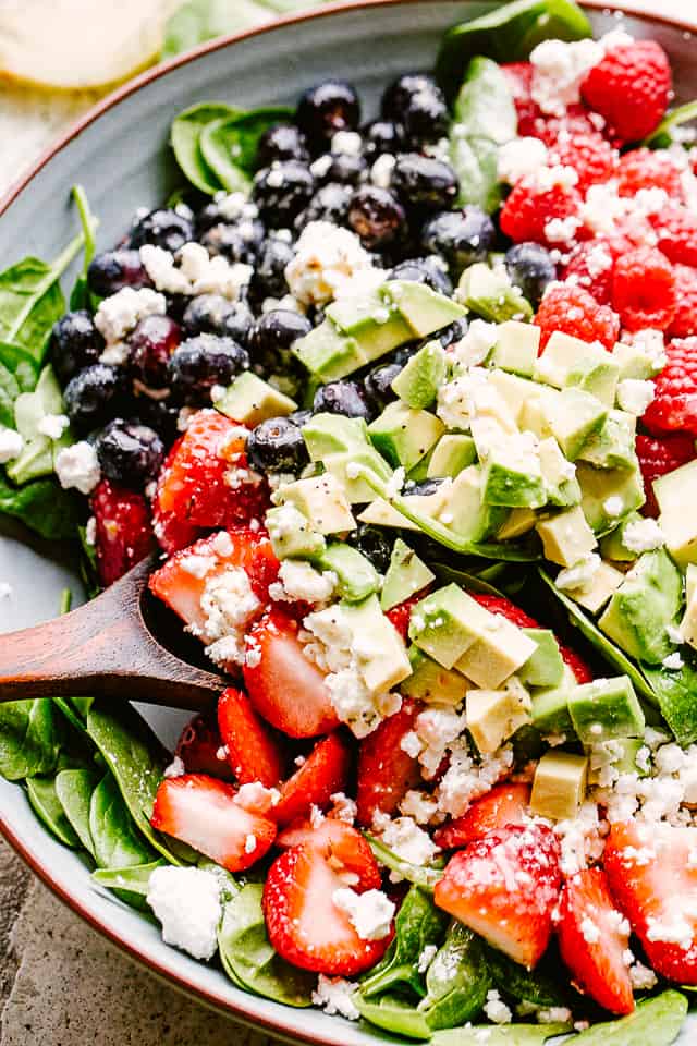 Esta ensalada de aguacate Very Berry está rellena de bayas frescas y aguacates maduros. ¡Es tan dulce y refrescante y perfecto para un plato de verano saludable para hacer barbacoas!