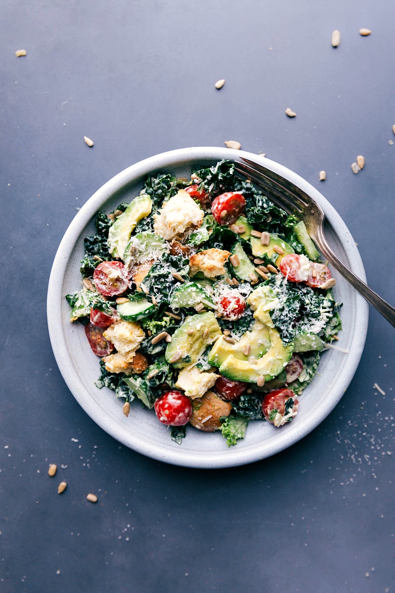 repollo Palta ensalada Está lleno de un sabor increíble y texturas increíbles. La col rizada fresca está cubierta con pepinos crujientes, tomates jugosos, rodajas de aguacate cremoso, semillas de girasol tostadas, picatostes crujientes y queso parmesano picante. Esta ensalada se mezcla con un aderezo de aguacate y limón.