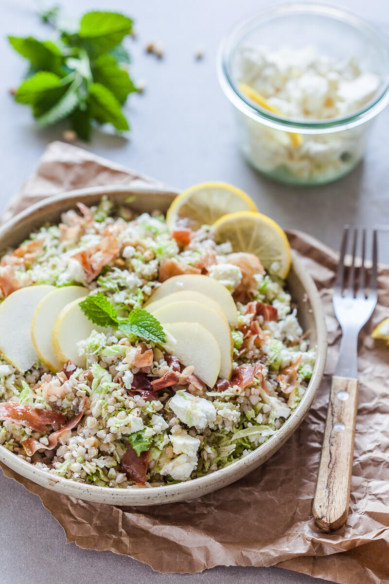 - En un tazón grande, agregue las coles de Bruselas en rodajas, el trigo sarraceno cocido, los piñones tostados, el jamón picado y el queso feta desmenuzado. Rebana o rebana una pera y agrégala a la ensalada.
