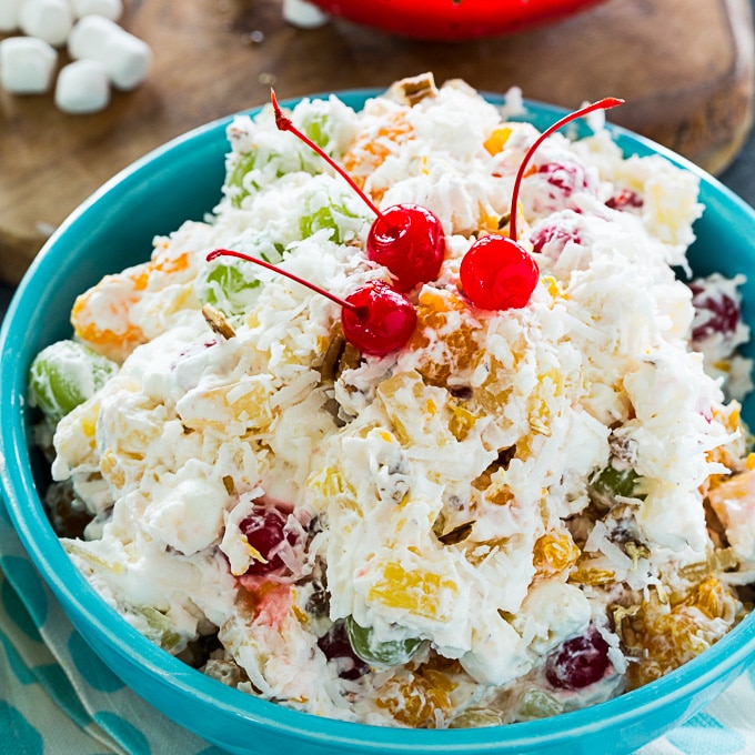 Esta ensalada sureña de ambrosía está rellena de piña, mandarinas, uvas, cerezas al marrasquino, malvaviscos y nueces. Y, por supuesto, coco. Se revuelve en crema batida con un poco de crema mezclada.