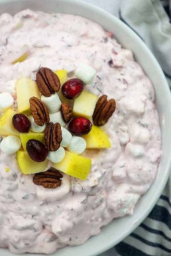 ¡La ENSALADA DE ARÁNDANO es un alimento básico de nuestra casa! Se puede servir como postre o guarnición, pero normalmente lo comemos como guarnición. Viene cargado con arándanos frescos, manzanas, piñas y nueces y luego se mezcla con la cobertura batida.