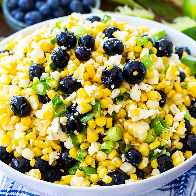 Esta ensalada va muy bien con bistec o pollo a la parrilla. También puede agregar camarones a la parrilla a esta ensalada de arándanos, maíz y queso feta y convertirla en un plato principal. ¡Perfecto para una comida ligera de verano!