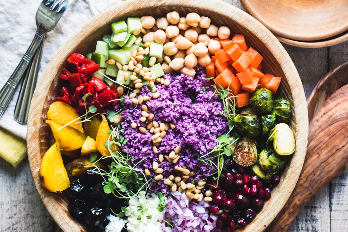 My Purple Coliflower Rice Salad combina ingredientes otoñales con un toque mediterráneo en una colorida base de arroz de coliflor sin gluten: este plato explora la idea de lo que debería ser una ensalada.