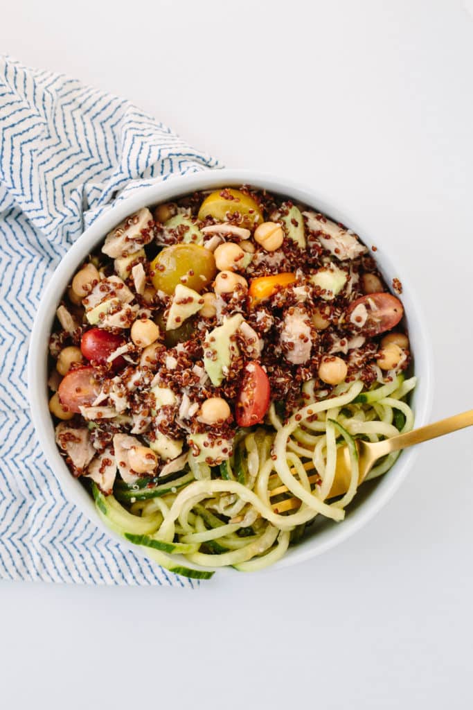 - Divide los fideos de pepino en tazones y agrega la mezcla de atún y quinoa. Atender.