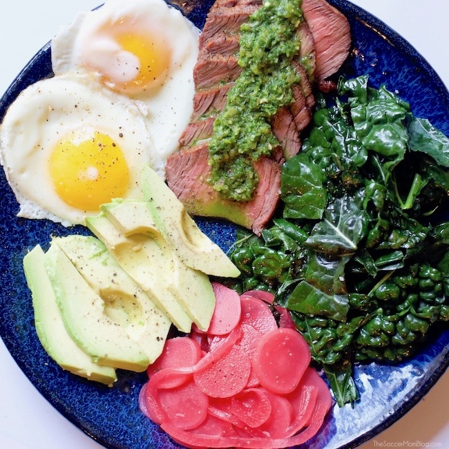Para darle un toque extra de sabor, cubrimos nuestros bistecs con una cucharada generosa de salsa chimichurri fresca. (Obtenga la receta fácil de 5 minutos aquí). ¡Aunque tengo que admitir que estos bistecs estaban deliciosos solos!