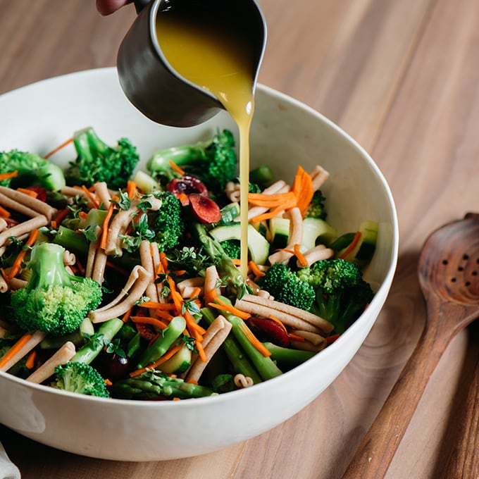 Esta ensalada de pasta con brócoli es una versión de temporada más liviana y saludable del clásico espagueti de trigo integral que aguanta bien una marinada prolongada. ¡Rápido y fácil, está listo en menos de 30 minutos!