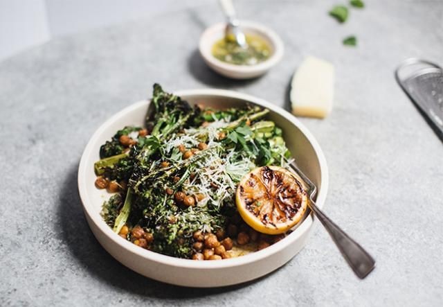 Coloca el br贸coli en una fuente y agrega los garbanzos crujientes. Vierta la salsa de lim贸n carbonizado y espolvoree con menta, perejil y pecorino.