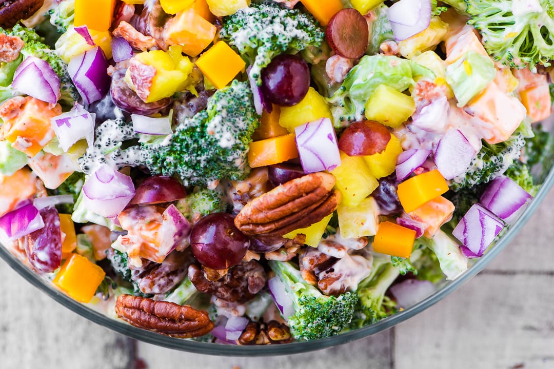 Las ensaladas de brócoli son un alimento básico por una buena razón, llenas de delicias y crujientes frescos que no se darán por vencidos. Busco brócoli verde brillante y me gusta separar los floretes con la punta de un cuchillo para conservar su forma. El brócoli mantendrá su gran frescura durante días en la nevera.