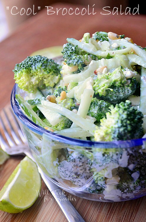 Ensalada de brócoli refrescante y ligera repleta de brócoli fresco, pepinos, piñones, menta, yogur griego y más. Perfecto acompañamiento de verano.