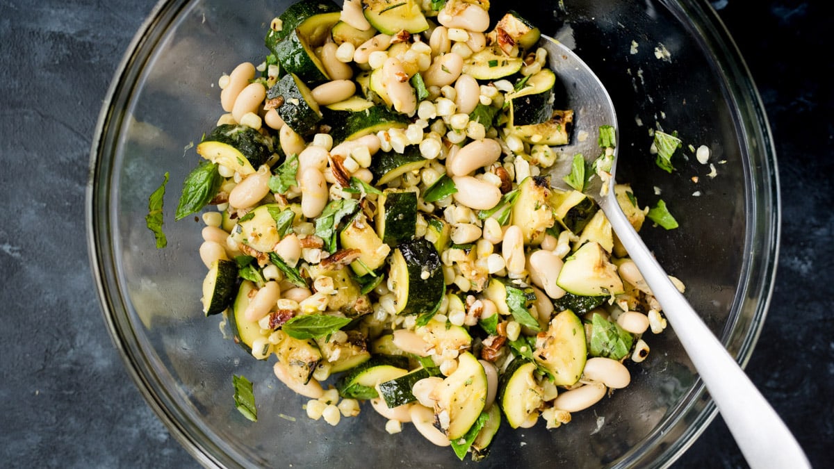 Esta ensalada de calabacín es tan simple como marinar, mezclar y comer. Marinar frijoles blancos enlatados cremosos para realzar el sabor. Mientras se prepara, asa el maíz fresco y el calabacín tierno, luego átalo todo junto con una salsa flash y albahaca fresca. ¡Naturalmente sin gluten y vegetariano, con simples subs para hacerlo vegano!
